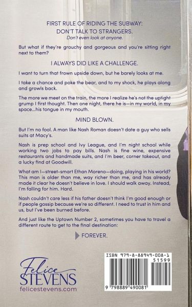 First rule of riding the subway: Don't talk to strangers. Don't even look at anyone. But what if they're grouchy and gorgeous and you're sitting right next to them? I always did like a challenge. I want to turn that frown upside down, but he barely looks at me. I take a chance and poke the bear, and to my shock, he plays along and growls back. The more we meet on the train, the more I realize he's not the uptight grump I first thought. Then one night, there he is-in my world, in my space...his tongue in my mouth. Mind blown. But I'm no fool. A man like Nash Roman doesn't date a guy who sells suits at Macy's. Nash is prep school and Ivy League, and I'm night school while working two jobs to pay bills. Nash is fine wine, expensive restaurants and handmade suits, and I'm beer, corner takeout, and a lucky find at Goodwill. What am I-street-smart Ethan Moreno-doing, playing in his world? This man is older than me, way richer than me, and has already made it clear he doesn't believe in love. I should walk away. Instead, I'm falling for him. Hard. Nash couldn't care less if his father doesn't think I'm good enough or if people gossip because we're so different. I need to trust in him and us, but I've been burned before. And just like the Uptown Number 2, sometimes you have to travel a different route to get to the final destination: Forever.