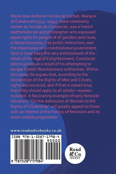 "On the Admission of Women to the Rights of Citizenship" is a 1789 essay by French philosopher Nicolas de Condorcet. Marie Jean Antoine Nicolas de Caritat, Marquis of Condorcet (1743-1794), more commonly known as Nicolas de Condorcet, was a French mathematician and philosopher who espoused equal rights people of all genders and races, a liberal economy, free public instruction, and the importance of a constitutional government. Said to have been the very embodiment of the ideals of the Age of Enlightenment, Condorcet died in prison as a result of his attempting to escape French Revolutionary authorities. Within this essay, he argues that, according to the Declaration of the Rights of Man and Citizen, rights are universal; and if that is indeed true, then they should apply to all adults--women included. A fascinating example of early feminist literature, "On the Admission of Women to the Rights of Citizenship" will greatly appeal to those with an interest in the history of feminism and its most notable proponents. Read & Co. Great Essays is proudly republishing this classic essay now in a new edition complete with a specially-commissioned new biography of the author.