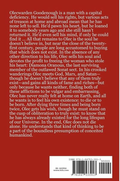 Olecwarden Goodenough is a man with a capital deficiency. He would sell his rights, but various acts of treason mean that he has none left to sell. He'd pawn his heart, but he loaned it to somebody years ago and she still hasn't returned it. He'd even sell his mind, if only he could find it. All that remains to Olec is the soul he doesn't believe in, which he sells in order to free the woman who borrowed his heart: Diamona Oranous, the last surviving member of the outlawed Sonat sect. Olec has never really felt at home on Earth, and all he wants is to feel his own existence: to die or to be born. After dying three times and being born twice, Olec gets his wish, though he must stand on the cusp of obliteration to truly exist: to know that he has always already existed for the long lifespan of our Universe. In the end, Olec does not die alone. He understands that kind of thinking to be a part of the boundless presumption of conceited humankind.