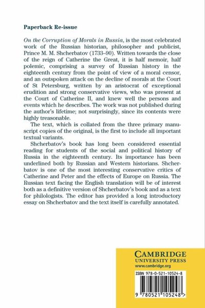 On the Corruption of Morals in Russia, is the most celebrated work of the Russian historian, philosopher and publicist Prince M. M. Shcherbatov (1733 90).