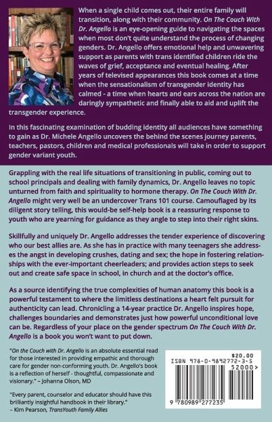 When a single child comes out, their entire family will transition, along with their community. On The Couch With Dr. Angello is an eye-opening guide to navigating social spaces when most don't quite understand the process of changing genders. Dr. Angello offers emotional help and unwavering support as parents with trans identified children ride the waves of grief, acceptance and eventual healing. After years of televised appearances this book comes at a time when the sensationalism of transgender identity has calmed-a time when hearts and ears across the nation are daringly sympathetic and finally able to aid and uplift the transgender experience. In this fascinating examination of budding identity all audiences have something to gain as Dr. Michele Angello uncovers the behind the scenes journey parents, teachers, pastors, children and medical professionals will take in order to support gender variant youth. Grappling with the real life situations of transitioning in public, coming out to school principals and dealing with family dynamics, Dr. Angello leaves no topic unturned from faith and spirituality to hormone therapy. On The Couch With Dr. Angello might very well be an undercover Trans 101 course. Camouflaged by its diligent story telling, this would-be self-help book is a reassuring response to youth who are yearning for guidance as they angle to step into their right skins. Skillfully and uniquely Dr. Angello addresses the tender experience of discovering who our best allies are. As she has in practice with many teenagers she addresses the angst in developing crushes, dating and sex; the hope in fostering relationships with the ever-important cheerleaders; and provides action steps to seek out and create safe space in school, in church and the doctor's office. As a source identifying the true complexities of human anatomy this book is a powerful testament to where the limitless destinations a heart felt pursuit for authenticity can lead. Chronicling a 14-year practice, Dr. Angello inspires hope, challenges boundaries and demonstrates just how powerful unconditional love can be. Regardless of your place on the gender spectrum On The Couch With Dr. Angello is a book you won't want to put down.