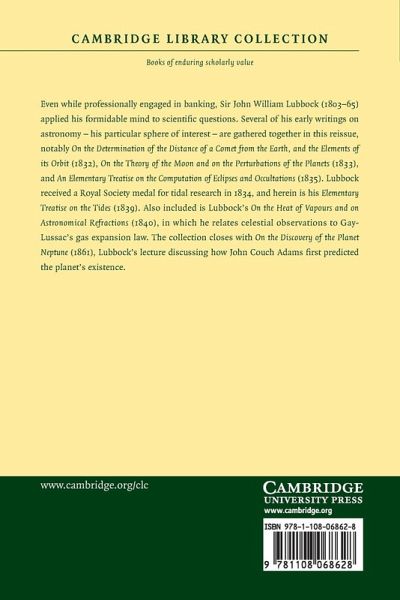 Even while professionally engaged in banking, Sir John William Lubbock (1803-65) applied his formidable mind to scientific questions. Several of his early writings on astronomy - his particular sphere of interest - are gathered together in this reissue, notably On the Determination of the Distance of a Comet from the Earth, and the Elements of its Orbit (1832), On the Theory of the Moon and on the Perturbations of the Planets (1833), and An Elementary Treatise on the Computation of Eclipses and Occultations (1835). Lubbock received a Royal Society medal for tidal research in 1834, and herein is his Elementary Treatise on the Tides (1839). Also included is Lubbock's On the Heat of Vapours and on Astronomical Refractions (1840), in which he relates celestial observations to Gay-Lussac's gas expansion law. The collection closes with On the Discovery of the Planet Neptune (1861), Lubbock's lecture discussing how John Couch Adams first predicted the planet's existence.