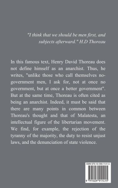 "I think that we should be men first, and subjects afterward." H.D Thoreau In this famous text, Henry David Thoreau does not define himself as an anarchist. Thus, he writes, "unlike those who call themselves no-government men, I ask for, not at once no government, but at once a better government". But at the same time, Thoreau is often cited as being an anarchist. Indeed, it must be said that there are many points in common between Thoreau's thought and that of Malatesta, an intellectual figure of the libertarian movement. We find, for example, the rejection of the tyranny of the majority, the duty to resist unjust laws, and the denunciation of state violence. Contents : H.D Thoreau : On the Duty of Civil Disobedience E. Malatesta : Anarchy
