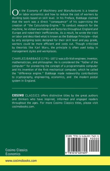 On the Economy of Machinery and Manufactures is a treatise on labor economics and how to reduce the cost of workers by dividing tasks based on skill level. In his Preface, Babbage claimed that the work was a direct "consequence" of his supervising the creation of "the Calculating-Engine." To conduct research for the machine, he visited workshops and factories throughout England and Europe and noted their inefficiencies. As a result, he wrote the tract on labor and described what is known as the Babbage Principle-that by only assigning tasks designed for their skill level and pay grade, workers could be more efficient and costs cut. Though criticized by theorists like Karl Marx, the principle is often used today in management styles and workplaces. CHARLES BABBAGE (1791-1871) was a British engineer, inventor, mathematician, and philosopher. He is considered the "father of the computer" for pioneering the concept of a programmable computer and his invention of the first mechanical computer, which he called the "difference engine." Babbage made noteworthy contributions to cryptography, engineering, economics, and the modern postal system in England.