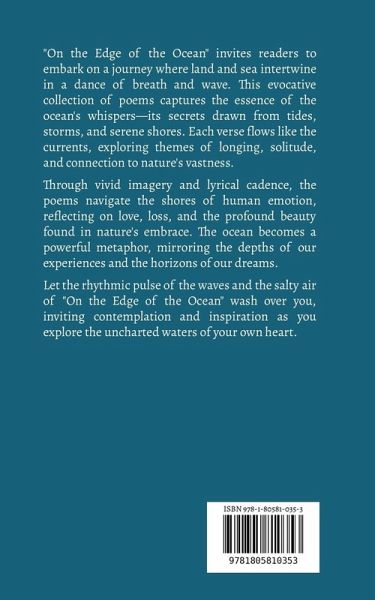 "On the Edge of the Ocean" invites readers to embark on a journey where land and sea intertwine in a dance of breath and wave. This evocative collection of poems captures the essence of the ocean's whispers-its secrets drawn from tides, storms, and serene shores. Each verse flows like the currents, exploring themes of longing, solitude, and connection to nature's vastness. Through vivid imagery and lyrical cadence, the poems navigate the shores of human emotion, reflecting on love, loss, and the profound beauty found in nature's embrace. The ocean becomes a powerful metaphor, mirroring the depths of our experiences and the horizons of our dreams. Let the rhythmic pulse of the waves and the salty air of "On the Edge of the Ocean" wash over you, inviting contemplation and inspiration as you explore the uncharted waters of your own heart.