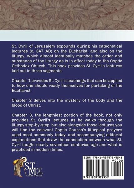 St. Cyril of Jerusalem expounds during his catechetical lectures (c. 347 AD) on the Eucharist, and also on the liturgy, which closely matches the order and substance of the liturgy as is in effect today in the Coptic Orthodox Church.