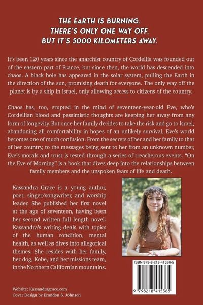 It's been 120 years since the anarchist country of Cordellia was founded out of the eastern part of France, but since then, the world has descended into chaos. A black hole has appeared in the solar system, pulling the Earth in the direction of the sun, promising death for everyone. The only way off the planet is by a ship in Israel, only allowing access to citizens of the country. Chaos has, too, erupted in the mind of seventeen-year-old Eve, whose Cordellian blood and pessimistic thoughts are keeping her away from any form of longevity. But once her family decides to take the risk and go to Israel, abandoning all comfortability in hopes of an unlikely survival, Eve's world becomes one of much confusion. From the secrets of her and her family, to that of her country, to the messages being sent to her from an unknown number, Eve's morals and trust are tested through a series of treacherous events. "On the Eve of Morning" is a book that dives deep into the relationships between family members and the unspoken fears of life and death.