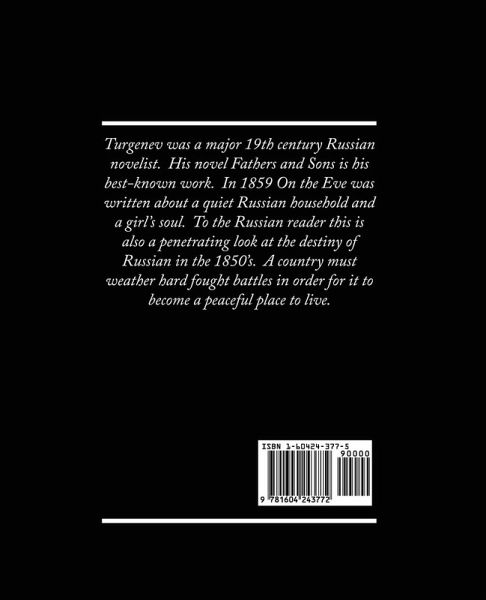Turgenev was a major 19th century Russian novelist. His novel Fathers and Sons is his best-known work. In 1859 On the Eve was written about a quiet Russian household and a girl's soul. To the Russian reader this is also a penetrating look at the destiny of Russian in the 1850's. A country must weather hard fought battles in order for it to become a peaceful place to live.