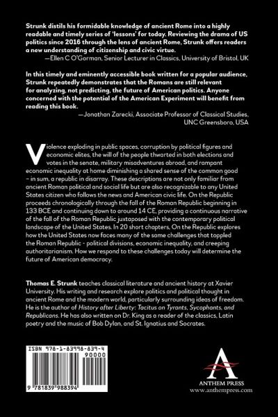 On the Republic juxtaposes the fall of the Roman Republic with the contemporary political landscape of the United States: a republic in disarray, violence and corruption thwarting the will of the people, military misadventures abroad, and rampant economic inequality diminishing a shared sense of the common good.