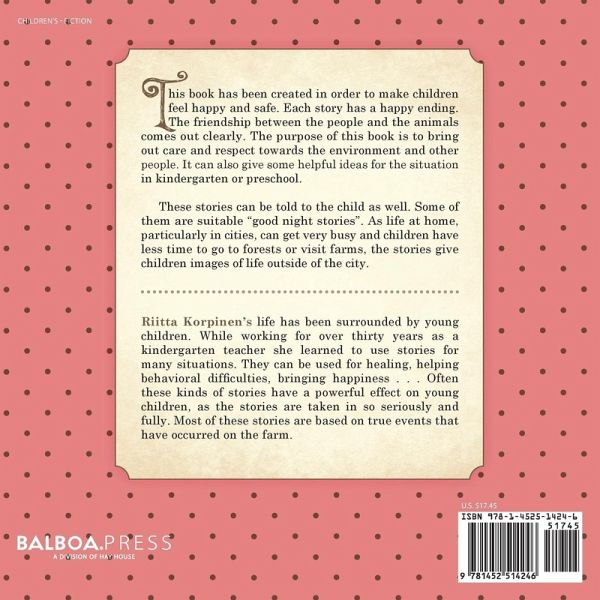 This book has been created in order to make children feel happy and safe. Each story has a happy ending. The friendship between the people and the animals comes out clearly. The purpose of this book is to bring out care and respect towards the environment and other people. It can also give some helpful ideas for the situation in kindergarten or preschool. These stories can be told to the child as well. Some of them are suitable "good night stories". As life at home, particularly in cities, can get very busy and children have less time to go to forests or visit farms, the stories give children images of life outside of the city.