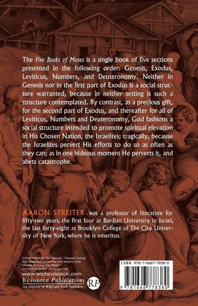 The Five Books of Moses is a single book of five sections presented in the following order: Genesis, Exodus, Leviticus, Numbers, and Deuteronomy. Neither in Genesis nor in the first part of Exodus is a social structure warranted, because in neither setting is such a structure contemplated. By contrast, as a precious gift, for the second part of Exodus, and thereafter for all of Leviticus, Numbers and Deuteronomy, God fashions a social structure intended to promote spiritual elevation in his chosen nation, the Israelites; tragically, because the Israelites pervert his efforts to do so as often as they can; as in one hideous moment he perverts it, and abets catastrophe.