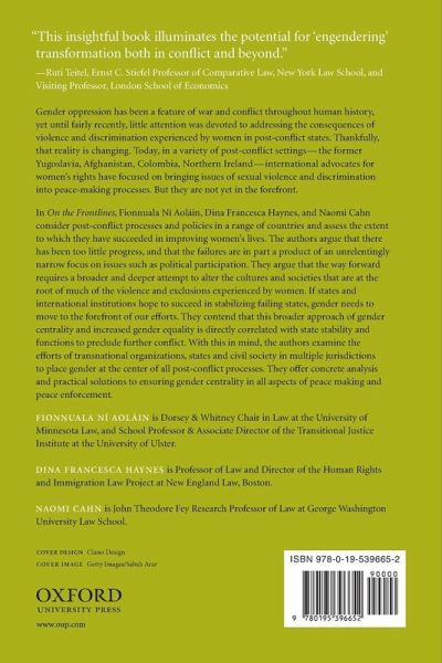 Gender oppression has been a feature of war and conflict throughout human history, yet until fairly recently, little attention was devoted to addressing the consequences of violence and discrimination experienced by women in post-conflict states. Thankfully, that is changing. Today, in a variety of post-conflict settings--the former Yugoslavia, Afghanistan, Colombia, Northern Ireland --international advocates for women's rights have focused bringing issues of sexual violence, discrimination and exclusion into peace-making processes. In On the Frontlines, Fionnuala Ni Aolain, Dina Francesca Haynes, and Naomi Cahn consider such policies in a range of cases and assess the extent to which they have had success in improving women's lives. They argue that there has been too little success, and that this is in part a product of a focus on schematic policies like straightforward political incorporation rather than a broader and deeper attempt to alter the cultures and societies that are at the root of much of the violence and exclusions experienced by women. They contend that this broader approach would not just benefit women, however. Gender mainstreaming and increased gender equality has a direct correlation with state stability and functions to preclude further conflict. If we are to have any success in stabilizing failing states, gender needs to move to fore of our efforts. With this in mind, they examine the efforts of transnational organizations, states and civil society in multiple jurisdictions to place gender at the forefront of all post-conflict processes. They offer concrete analysis and practical solutions to ensuring gender centrality in all aspects of peace making and peace enforcement.