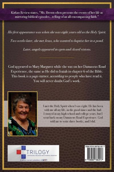 Kirkus Review states, "Ms. Brown often presents the events of her life as mirroring biblical episodes...telling of an all-encompassing faith." ¿¿His first appearance was when she was eight years old as the Holy Spirit. Two weeks later, she met Jesus, who wanted to baptize her in a pond. Later, angels appeared in open and closed visions. God appeared to Mary Margaret while she was on her Damascus Road Experience, the same as He did to Isaiah in chapter 6 of the Bible. This book is a page-turner, according to people who have read it. You will never doubt God's work.