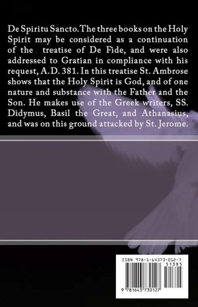 De Spiritu Sancto. The three books on the Holy Spirit may be considered as a continuation of the treatise of De Fide, and were also addressed to Gratian in compliance with his request, A.D. 381. In this treatise St. Ambrose shows that the Holy Spirit is God, and of one nature and substance with the Father and the Son. He makes use of the Greek writers, SS. Didymus, Basil the Great, and Athanasius, and was on this ground attacked by St. Jerome.