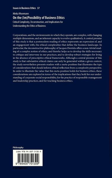 Corporations, and the environments in which they operate, are complex, with changing multiple dimensions, and an inherent capacity to evolve qualitatively. A central premise of this study is that a postmodern reading of ethics represents an expression of, and an engagement with, the ethical complexities that define the business landscape. In particular, the deconstructive philosophy of Jacques Derrida offers a non-trivial reading of a complex notion of ethics, and thereby helps us to develop the skills necessary to critique and intervene in our practices, and to develop robust strategies for living in the absence of prescriptive ethical frameworks. Although a central premise of this study is that substantive ethical claims can only be generated within a given context, the study nevertheless presents readers with a meta-position that illustrates the type of considerations that should inform ethical reflection from a complexity perspective. In order to illustrate the value that this meta-position holds for business ethics, these considerations are explored in terms of the implications that they hold for our understanding of corporate social responsibility, for the practice of responsible management and leadership practices, and for teaching business ethics.