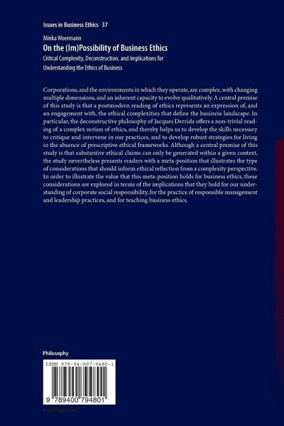 Corporations, and the environments in which they operate, are complex, with changing multiple dimensions, and an inherent capacity to evolve qualitatively. A central premise of this study is that a postmodern reading of ethics represents an expression of, and an engagement with, the ethical complexities that define the business landscape. In particular, the deconstructive philosophy of Jacques Derrida offers a non-trivial reading of a complex notion of ethics, and thereby helps us to develop the skills necessary to critique and intervene in our practices, and to develop robust strategies for living in the absence of prescriptive ethical frameworks. Although a central premise of this study is that substantive ethical claims can only be generated within a given context, the study nevertheless presents readers with a meta-position that illustrates the type of considerations that should inform ethical reflection from a complexity perspective. In order to illustrate the value that this meta-position holds for business ethics, these considerations are explored in terms of the implications that they hold for our understanding of corporate social responsibility, for the practice of responsible management and leadership practices, and for teaching business ethics.