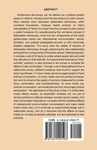 discussions on public issues. Most scholars have discussed deliberative democracy within normative boundaries. However, based primarily on Katz's interpretation of Tarde, this study finds the concept of public sphere a useful framework for operationalizing the normative concept of deliberative democracy, since the four components of the public sphere-news media use, interpersonal communication, opinion formation, and political participation-provide us with empirically testable categories. This study tests the validity of theories of deliberative democracy through examining the inter-relationships among the four components of the public sphere. Methodologically, it includes a set of 63 items to probe where people talk and what they talk about in their daily life. An experimental treatment (a "stop-and-talk" question) is also included in the survey to simulate the effects of real conversation. Through a set of data gathered from a nationwide survey, sufficient evidence was found to support the basic hypotheses: (1) news media use encourages people to have political conversation, (2) news media use and political conversation tend to enhance the quality of opinions (measured by consistency, opinionation, and consideredness), (3) news media use, political conversation, and enhanced opinions encourage political participation. The significance of this study is that: (1) unlike other media effects studies, its dependent variables are not just of opinion positions or attitude changes, but also opinion quality; (2) it does not consider media alone, but deals with the combined effects of interpersonal communication (conversation) and mass media (news media use); (3) it combines an experimental design with a nationwide survey; and (4) it assumes that the effects of mass media do not stop at people's attitudes, but are extended to their activities.