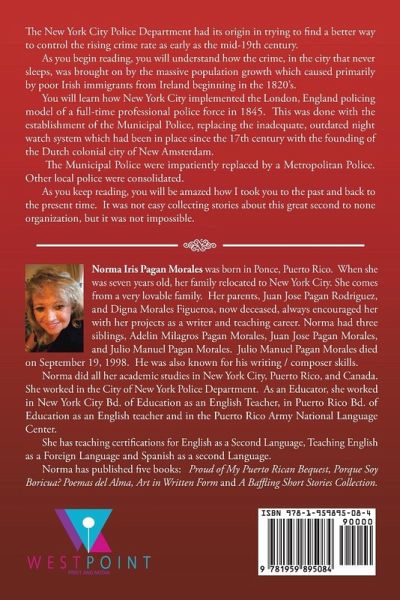 The New York City Police Department had its origin in trying to find a better way to control the rising crime rate as early as the mid-19th century. As you begin reading, you will understand how the crime, in the city that never sleeps was brought on by the massive population growth which caused primarily by poor Irish immigrants from Ireland beginning in the 1820s. You will learn how New York City implemented the London, England policing model of a full-time professional police force in 1845. This was done with the establishment of the Municipal Police, replacing the inadequate, outdated night watch system which had been in place since the 17th century with the founding of the Dutch colonial city of New Amsterdam. The Municipal Police were impatiently replaced by a Metropolitan Police. Other local police were consolidated. As you keep reading, you will be amazed how I took you to the past and back to the present time. It was not easy collecting stories about this great second-to-none organization, but it was not impossible. Norma Iris Pagan Morales was born in Ponce, Puerto Rico. When she was seven years old, her family relocated to New York City. She comes from a very lovable family. Her parents, Juan Jose Pagan Rodriguez, and Digna Morales Figueroa, now deceased, always encouraged her with her projects as a writer and teaching career. Norma had three siblings, Adelin Milagros Pagan Morales, Juan Jose Pagan Morales, and Julio Manuel Pagan Morales. Julio Manuel Pagan Morales died on September 19, 1998. He was also known for his writing/composer skills. Norma did all her academic studies in New York City, Puerto Rico, and Canada. She worked in the City of New York Police Department. As an Educator, she worked in New York City Bd. of Education as an English Teacher, in Puerto Rico Bd. of Education as an English teacher and in the Puerto Rico Army National Language Center. She has teaching certifications for English as a Second Language, Teaching English as a Foreign Language and Spanish as a second Language. Norma has published five books: Proud of My Puerto Rican Bequest, Porque Soy Boricua? Poemas del Alma, Art in Written Form and A Baffl ing Short Stories Collection.