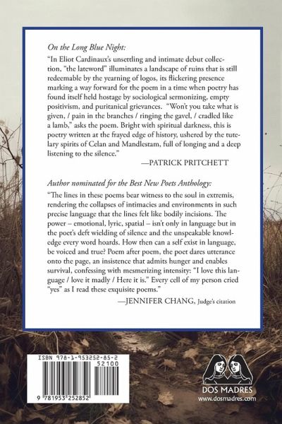 In On the Long Blue Night, Eliot Cardinaux's debut poetry collection, language is a ruined landscape through which the estranged voice of the poem threads a narrow way. As Patrick Pritchett writes, "this is poetry written at the frayed edge of history, ushered by the tutelary spirits of Celan and Mandlestam, full of longing and a deep listening to the silence." SAMPLE: Daily Become Human Again For Isabel Duarte-Gray Clutter of branches in public, indifferent language of a bleak sky Won't you take what is given, pain in the branches ringing the gavel, cradled like a lamb The whole stretching out in a blanket of tears, a corporeal fugue