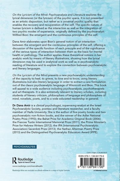 On the Lyricism of the Mind: Psychoanalysis and Literature explores the lyrical dimension (or the lyricism) of the psychic space. It is not presented as an artistic disposition, but rather as a universal psychic quality which enables the recovery and recuperation of the self. The specific nature of human lyricism is defined as the interaction as well as the integration of two psychic modes of experience originally defined by the psychoanalyst Wilfred Bion: The emergent and the continuous principles of the self.