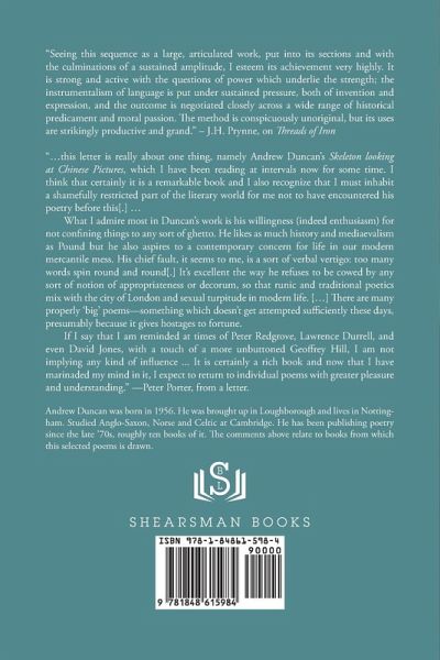 "For the last 30 years, Andrew Duncan has patiently traced alternative wavelengths, to and from the unevocable, irreconcilable and the impossible."-Kevin Nolan "Seeing this sequence as a large, articulated work, put into its sections and with the culminations of a sustained amplitude, I esteem its achievement very highly. It is strong and active with the questions of power which underlie the strength; the instrumentalism of language is put under sustained pressure, both of invention and expression, and the outcome Is negotiated closely across a wide range of historical predicament and moral passion. The method is conspicuously unoriginal, but its uses are strikingly productive and grand." -J.H. Prynne, on Threads of Iron "... this letter is really about one thing, namely Andrew Duncan's Skeleton looking at Chinese Pictures, which I have been reading at intervals now for some time. I think that certainly it is a remarkable book and I also recognize that I must inhabit a shamefully restricted part of the literary world for me not to have encountered his poetry before this[.] ... What I admire most in Duncan's work is his willingness (indeed enthusiasm) for not confining things to any sort of ghetto. He likes as much history and mediaevalism as Pound but he also aspires to a contemporary concern for life in our modern mercantile mess. His chief fault, it seems to me, is a sort of verbal vertigo: too many words spin round and round[.] It's excellent the way he refuses to be cowed by any sort of notion of appropriateness or decorum, so that runic and traditional poetics mix with the city of London and sexual turpitude in modern life. [...] There are many properly 'big' poems-something which doesn't get attempted sufficiently these days, presumably because it gives hostages to fortune. If I say that I am reminded at times of Peter Redgrove, Lawrence Durrell, and even David Jones, with a touch of a more unbuttoned Geoffrey Hill, I am not implying any kind of influence ... It is certainly a rich book and now that I have marinaded my mind in it, I expect to return to individual poems with greater pleasure and understanding." -Peter Porter, from a letter.