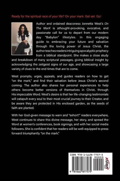 Ready for the spiritual race of your life? On your mark. Get set. Go! Author and ordained deaconess Jonnetta West's On The MarK is athought-provoking, evocative, and passionate call for us to depart from our modern day "Babylon" lifestyles. In this engaging guide to embracing your future and salvation through the loving power of Jesus Christ, the author teaches readers intriguing apocalyptic prophecy from a biblical standpoint. She makes a close study and breakdown of many scriptural passages, giving biblical insight by acknowledging the zeitgeist signs of our age, and showcasing a large variety of clues to the end times that are to come. West prompts, urges, appeals, and guides readers on how to get "on the mark," and find their salvation before Jesus Christ's second coming. The author also shares her personal experiences to help others become better versions of themselves in Christ, through His impeccable Word. West's desire is that her life-changing testimonials will catapult every soul to their most crucial journey to their Creator, and be aware they are protected in His enclosed garden, as the seeds of faith are planted. With her God-given message to warn and "exhort!" readers everywhere, West continues to share this divine message, her story, and spread the Word at women's conferences, book signings, and with her social media followers. She is confident that her readers will be well-equipped to press forward triumphantly "on the mark."
