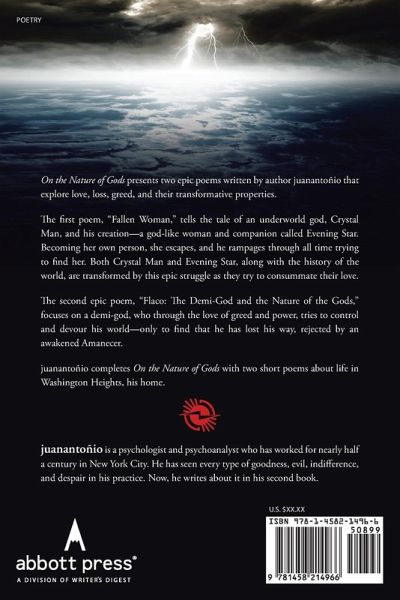 On the Nature of Gods presents two epic poems written by author juanantoñio that explore love, loss, greed, and their transformative properties. The first poem, "Fallen Woman," tells the tale of an underworld god, Crystal Man, and his creation-a god-like woman and companion called Evening Star. Becoming her own person, she escapes, and he rampages through all time trying to find her. Both Crystal Man and Evening Star, along with the history of the world, are transformed by this epic struggle as they try to consummate their love. The second epic poem, "Flaco: The Demi-God and the Nature of the Gods," focuses on a demi-god, who through the love of greed and power, tries to control and devour his world-only to find that he has lost his way, rejected by an awakened Amanecer. juanantoñio completes On the Nature of Gods with two short poems about life in Washington Heights, his home.