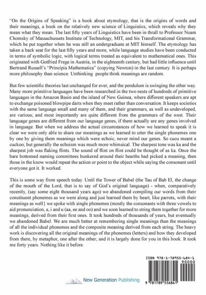 "On the Origins of Speaking" is a book about etymology, that is the origins of words and their meanings, a book on the relatively new science of Linguistics, which reveals why they mean what they mean. The last fifty years of Linguistics have been in thrall to Professor Noam Chomsky of Massachussets Institute of Technology, MIT, and his Transformational Grammar, which he put together when he was still an undergraduate at MIT himself. The etymology has taken a back seat for the last fifty years and more, while language studies have been conducted in terms of symbolic logic, with logical terms treated as equivalent to mathematical ones. This originated with Gotfried Frege in Austria, in the eighteenth century, but had little influence until Bertrand Russell's "Principia Mathematica" (copying Newton) in the last century. It is perhaps more philosophy than science. Unthinking people think meanings are random. But few scientific theories last unchanged for ever, and the pendulum is swinging the other way. Many more primitive languages have been researched in the two nests of hundreds of primitive languages in the Amazon Basin and the island of New Guinea, where different speakers are apt to exchange poisoned blowpipe darts when they meet rather than conversation. It keeps societies with the same language small and many of them, and their grammars, as well as undeveloped, are various; and most importantly are quite different from the grammars of the west. Their language genes are different from our language genes, if there actually are any genes involved in language. But when we address the actual circumstances of how we learned to speak it is clear we were only able to share our meanings as we learned to utter the single phonemes one by one by giving them meanings which were echoic, never mind our genes. So cucu meant a cuckoo; but generally the echoism was much more whimsical. The sharpest tone was ka and the sharpest job was flaking flints. The sound of flint on flint could be thought of as ka. Once the bare bottomed naming committees hunkered around their hearths had picked a meaning, then those in the know would repeat the action or point to the object while saying the consonant until everyone got it. It worked. This is some way from speech today. Until the Tower of Babel (the Tau of Bab El, the change of the mouth of the Lord, that is to say of God's original language) - when, comparatively recently, (say some eight thousand years ago) we abandoned compiling our words from their constituent phonemes as we went along and just learned them by heart, like parrots, with their meanings as well} we spoke with single phonemes (mostly the consonants with three vowels to aid pronunciation, a, i and u (aa, ee and oo) and we soon learned to string them together for more meanings, derived from their first ones. It took hundreds of thousands of years, but eventually we abandoned Babel. We are much better at remembering single meanings than the meanings of all the individual phonemes and the composite meaning derived from each string. The heavy work is discovering all the original meanings of the phonemes (letters) and how they developed from there, by metaphor, one after the other; and it is largely done for you in this book. It took me forty years. Nothing like it before.