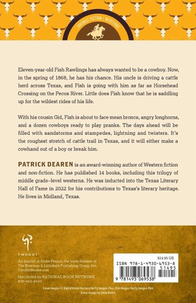 Eleven-year-old Fish Rawlings has always wanted to be a cowboy. Now, in the spring of 1868, he has his chance. His uncle is driving a cattle herd across Texas, and Fish is going with him as far as Horsehead Crossing on the Pecos River. Little does Fish know that he is saddling up for the wildest rides of his life. With his cousin Gid, Fish is about to face mean broncs, angry longhorns, and a dozen cowboys ready to play pranks. The days ahead will be filled with sandstorms and stampedes, lightning and twisters. It's the roughest stretch of cattle trail in Texas, and it will either make a cowhand out of a boy or break him.