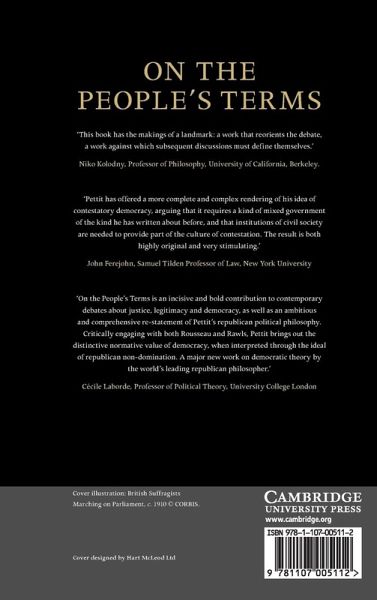 According to republican theory, we are free persons to the extent that we are protected and secured in the same fundamental choices, on the same public basis, as one another. But there is no public protection or security without a coercive state. Does this mean that any freedom we enjoy is a superficial good that presupposes a deeper, political form of subjection? Philip Pettit addresses this crucial question in On the People's Terms. He argues that state coercion will not involve individual subjection or domination insofar as we enjoy an equally shared form of control over those in power. This claim may seem utopian but it is supported by a realistic model of the institutions that might establish such democratic control. Beginning with a fresh articulation of republican ideas, Pettit develops a highly original account of the rationale of democracy, breathing new life into democratic theory.