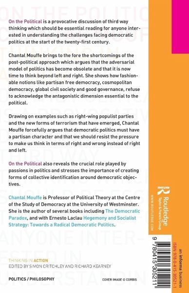 'On the Political is a thought-provoking book tackling urgent domestic and international political problems trhough a disputatious engagement with various contemporary domestic theory. Mouffe succeeds in presenting these problems and disputes in an accessible language.' - Environment and Planning D: Society and Space