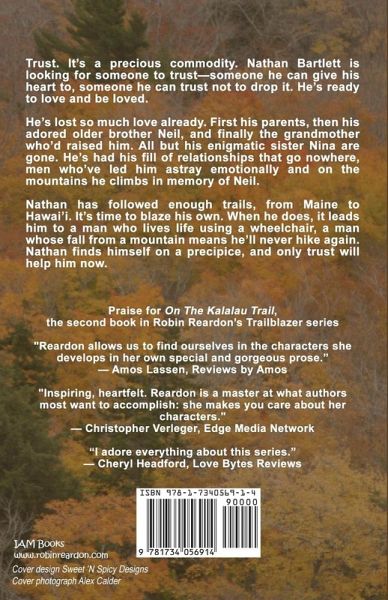 Trust. It's a precious commodity. Nathan Bartlett is looking for someone to trust-someone he can give his heart to, someone he can trust not to drop it. He's ready to love and be loved. He's lost so much love already. First his parents, then his adored older brother Neil, and finally the grandmother who'd raised him. All but his enigmatic sister Nina are gone. He's had his fill of relationships that go nowhere, men who've led him astray emotionally and on the mountains he climbs in memory of Neil. Nathan has followed enough trails, from Maine to Hawai'i. It's time to blaze his own. When he does, it leads him to a man who lives life using a wheelchair, a man whose fall from a mountain means he'll never hike again. Nathan finds himself on a precipice, and only trust will help him now.