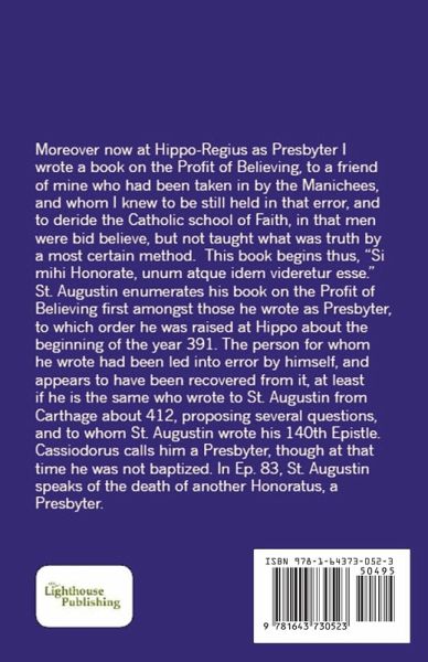 Moreover now at Hippo-Regius as Presbyter I wrote a book on the Profit of Believing, to a friend of mine who had been taken in by the Manichees, and whom I knew to be still held in that error, and to deride the Catholic school of Faith, in that men were bid believe, but not taught what was truth by a most certain method. This book begins thus, "Si mihi Honorate, unum atque idem videretur esse." St. Augustin enumerates his book on the Profit of Believing first amongst those he wrote as Presbyter, to which order he was raised at Hippo about the beginning of the year 391. The person for whom he wrote had been led into error by himself, and appears to have been recovered from it, at least if he is the same who wrote to St. Augustin from Carthage about 412, proposing several questions, and to whom St. Augustin wrote his 140th Epistle. Cassiodorus calls him a Presbyter, though at that time he was not baptized. In Ep. 83, St. Augustin speaks of the death of another Honoratus, a Presbyter.