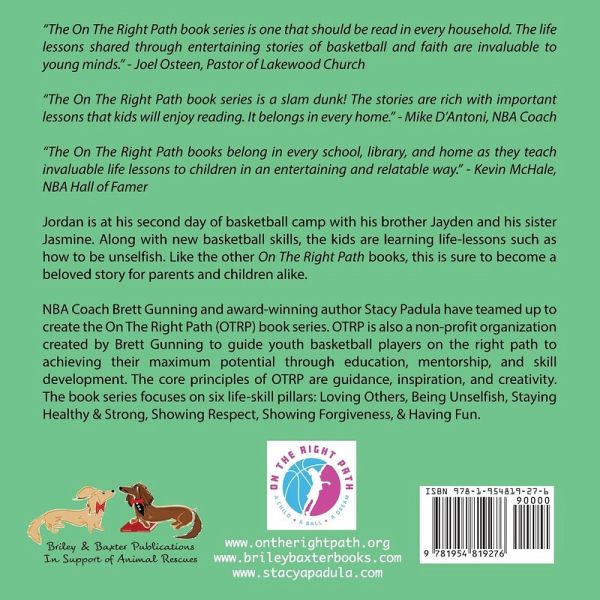A 2022 Readers' Choice Book Awards Finalist! "The On The Right Path book series is a slam dunk! The stories are rich with important lessons that kids will enjoy reading. It belongs in every home." - Mike D'Antoni, NBA Coach "The On The Right Path books belong in every school, library, and home, as they teach invaluable life lessons to children in an entertaining and relatable way." - Kevin McHale, NBA Hall of Famer Jordan is at his second day of basketball camp with his brother Jayden and his sister Jasmine. Along with new basketball skills, the kids are learning life-lessons such as how to be unselfish. Just like the other On The Right Path books, this is sure to become a beloved story for parents and children alike. NBA Coach Brett Gunning and award-winning author Stacy Padula have teamed up to create the On The Right Path (OTRP) book series. OTRP is also a non-profit organization created by Brett Gunning to guide youth basketball players on the right path to achieving their maximum potential through education, mentorship, and skill development. The core principles of OTRP are guidance, inspiration, and creativity. The book series focuses on six life-skill pillars: Loving Others, Being Unselfish, Staying Healthy & Strong, Showing Respect, Showing Forgiveness, and Having Fun.