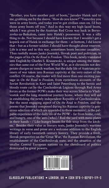 '"Brother, you have another pair of boots," Jaroslav Haek said to me, grabbing me by the sleeve. "How do you know?" "Yesterday you were in army boots, and today you've got civilian ones on. I'd buy those army boots off you." And in this way my high-laced boots, which I was given by the Austrian Red Cross way back in Beryozovka-za-Baikalom, came into Haek's possession. It was a silly thing to do. Not because I should have known that I wouldn't get a kopeck out of Haek in exchange for them - at bottom, I did know that - but as a former soldier, I should have thought about reserves. Life is a war and in this war, sometimes boots become casualties.' ¿Thus ruefully muses Janko Jesenský, Slovak poet and politician, in the pages of his On the Road to Freedom. This book, newly translated into English by Charles S. Kraszewski, is unique among the memoirs that came out of the First World War, as it chronicles not desperate charges or trench warfare, but the daily life of Austrian prisoners of war taken into Russian captivity at the very outset of the conflict. Of course, the reader will find more than one exciting passage in On the Road to Freedom, from eyewitness accounts of the Soviet Revolution in Kiev and Saint Petersburg to the heroic and bloody route cut by the Czechoslovak Legions through Red Army forces as the former POWs make their way across Siberia to Vladivostok and the long steamboat journey home, where they will aid in establishing the newly independent Republic of Czechoslovakia. But the most engaging aspect of On the Road to Freedom, and the poems that Jesenský composed during his Russian captivity (a generous selection of which are appended to these memoirs), is the palpable experience of the daily life of the POW - far from home, cold, and hungry, one of the 'ants [who] / Roil the yard with mess-plates in their hands - / Like hungry beasts for fish-soup from the kitchen.' Besides their value as literary texts, Janko Jesenský's wartime writings in verse and prose are a welcome addition to the English library of early twentieth century history. They provide a fresh, Slovak perspective on the 'Great War,' the Russian Revolution, the establishment of the Czechoslovak state, and the situation of the smaller Central European nations on the chessboard of politics dominated by great powers.
