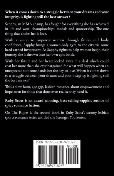 Ruby Scott is an award winning, best-selling-sapphic-author of spicy romance fiction. On The Ropes is the second book in Ruby Scott's steamy lesbian sports romance series entitled the Stronger You Series. When it comes down to a struggle between your dreams and your integrity, is fighting still the best answer? Sapphy, an MMA champ, has fought for everything she has achieved in life and won; championships, medals and sponsorship. The one thing that eludes her is love. With a vision to empower women through fitness and body confidence, Sapphy brings a women-only gym to the city via some hard earned investment. As Sapphy fights to help women begin their journey, she is thrown into her own epic battle. With her future and her heart locked away in a deal which could cost her more than she ever bargained for what will happen when an unexpected someone hands her the key to love. When it comes down to a struggle between your dreams and your integrity, is fighting still the best answer? This a slow burn, age gap, lesbian romance about empowerment and hope, even for those that don't even realise they need it.