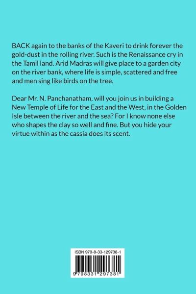 BACK again to the banks of the Kaveri to drink forever the gold-dust in the rolling river. Such is the Renaissance cry in the Tamil land. Arid Madras will give place to a garden city on the river bank, where life is simple, scattered and free and men sing like birds on the tree. Dear Mr. N. Panchanatham, will you join us in building a New Temple of Life for the East and the West, in the Golden Isle between the river and the sea? For I know none else who shapes the clay so well and fine. But you hide your virtue within as the cassia does its scent.