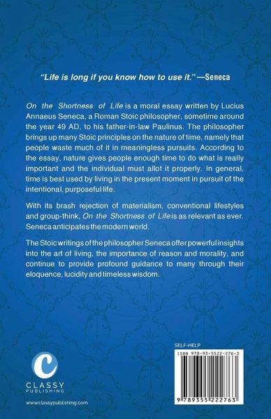 "Life is long if you know how to use it." -Seneca On the Shortness of Life is a moral essay written by Lucius Annaeus Seneca, a Roman Stoic philosopher, sometime around the year 49 AD, to his father-in-law Paulinus. The philosopher brings up many Stoic principles on the nature of time, namely that people waste much of it in meaningless pursuits. According to the essay, nature gives people enough time to do what is really important and the individual must allot it properly. In general, time is best used by living in the present moment in pursuit of the intentional, purposeful life. With its brash rejection of materialism, conventional lifestyles and group-think, On the Shortness of Life is as relevant as ever. Seneca anticipates the modern world. The Stoic writings of the philosopher Seneca offer powerful insights into the art of living, the importance of reason and morality, and continue to provide profound guidance to many through their eloquence, lucidity and timeless wisdom.