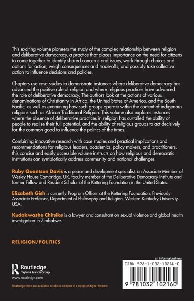 Chapters use case studies to demonstrate instances where deliberative democracy has advanced the positive role of religion and where religious practices have advanced the role of deliberative democracy. The authors look at the actions of various denominations of Christianity in Africa, the United States of America, and the South Pacific, as well as examining how such groups operate within the context of indigenous religions such as African Traditional Religion. This volume also explores instances where the absence of deliberative practices in religion has curtailed the ability of people to realise their full potential, and the ability of religious groups to act decisively for the common good to influence the politics of the times.
