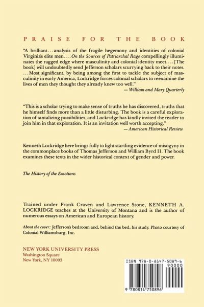 "A brilliant . . . analysis of the fragile hegemony and identities of colonial Virginia's elite men. . . . On the Sources of Patriarchal Rage compellingly illuminates the ragged edge where masculinity and colonial identity meet. . . . [the book] will undoubtedly send Jefferson scholars scurrying back to their notes. . . . Most significant, by being among the first to tackle the subject of masculinity in early America, Lockridge forces colonial scholars to reexamine the lives of men they thought they already knew too well." ?William and Mary Quarterly Two of the greatest of Virginia gentlemen, William Byrd II and Thomas Jefferson, each kept a commonplace book--in effect, a journal where men were to collect wisdom in the form of anecdotes and quotations from their readings with a sense of detachment and scholarship. Writing in these books, each assembled a prolonged series of observations laden with fear and hatred of women. Combining ignorance with myth and misogyny, Byrd's and Jefferson's books reveal their deep ambivalence about women, telling of women's lascivious nature and The Female Creed and invoking the fallible, repulsive, and implicitly corruptible female body as a central metaphor for all tales of social and political corruption. Were these private outbursts meaningless and isolated incidents, attributable primarily to individual pathology, or are they written revelations of the forces working on these men to maintain patriarchal control? Their hatred for women draws upon a kind of misogynistic reserve found in the continental and English intellectual traditions, but it also twists and recontextualizes less misogynistic excerpts to intensified effect. From this interplay of intellectual traditions and the circumstances of each man's life and later behavior arises the possibility one or more specific politics of misogyny is at work here. Kenneth Lockridge's work, replete with excerpts from the books themselves, leads us through these texts, exploring the structures, contexts, and significance of these writings in the wider historical context of gender and power. His book convincingly illustrates the ferocity of early American patriarchal rage; its various meanings, however suggestively explored here, must remain contestable.