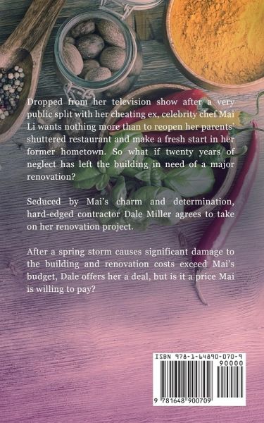 Dropped from her television show after a very public split with her cheating ex, celebrity chef Mai Li wants nothing more than to reopen her parents' shuttered restaurant and make a fresh start in her former hometown. So what if twenty years of neglect has left the building in need of a major renovation? Seduced by Mai's charm and determination, hard-edged contractor Dale Miller agrees to take on her renovation project. After a spring storm causes significant damage to the building and renovation costs exceed Mai's budget, Dale offers her a deal, but is it a price Mai is willing to pay?