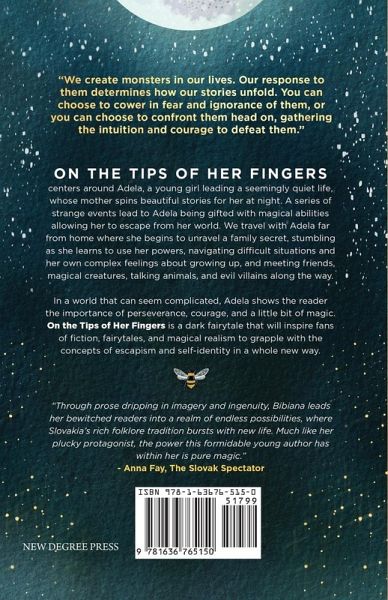 "We create monsters in our lives. Our response to them determines how our stories unfold. You can choose to cower in fear and ignorance of them, or you can choose to confront them head on, gathering the intuition and courage to defeat them." On the Tips of Her Fingers centers around Adela, a young girl leading a seemingly quiet life, whose mother spins beautiful stories for her at night. A series of strange events lead to Adela being gifted with magical abilities allowing her to escape from her world. We travel with Adela far from home where she begins to unravel a family secret, stumbling as she learns to use her powers, navigating difficult situations and her own complex feelings about growing up, and meeting friends, magical creatures, talking animals, and evil villains along the way. In a world that can seem complicated, Adela shows the reader the importance of perseverance, courage, and a little bit of magic. On The Tips of Her Fingers is a dark fairytale that will inspire fans of fiction, fairytales, and magical realism to grapple with the concepts of escapism and self-identity in a whole new way.