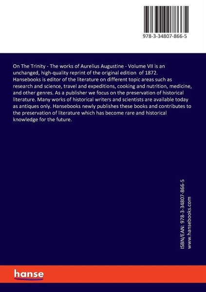 On The Trinity - The works of Aurelius Augustine - Volume VII is an unchanged, high-quality reprint of the original edition of 1872.Hansebooks is editor of the literature on different topic areas such as research and science, travel and expeditions, cooking and nutrition, medicine, and other genres. As a publisher we focus on the preservation of historical literature. Many works of historical writers and scientists are available today as antiques only. Hansebooks newly publishes these books and contributes to the preservation of literature which has become rare and historical knowledge for the future.