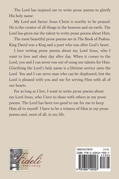 The Lord has inspired me to write prose poems to glorify His holy name. My Lord and Savior Jesus Christ is worthy to be praised. He is the creator of all things in the heavens and on earth. The Lord has given me the talent to write prose poems about Him. The most beautiful prose poems are in The Book of Psalms. King David was a King and a poet who was after God's heart. I love writing prose poems about my Lord Jesus, who I want to love and obey day after day. When it comes to the Lord, you and I can never run out of using our talents for Him. Glorifying the Lord's holy name is a lifetime service unto the Lord. You and I can serve man who can be displeased, but the Lord is pleased with you and me for serving Him with all of our hearts. For as long as I live, I want to write prose poems about my Lord Jesus, who I love to share with others in my prose poems. The Lord has been too good to me for me to keep Him all to myself. I have to be a witness of Him in my prose poems and, most of all, in my life.