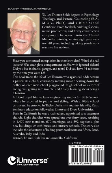 Have you ever caused an explosion in chemistry class? Wired the hall lockers? Was your glove compartment stuffed with ignored tickets? Did you live in shacks, garages, and tents? Did you have 74 addresses by the time you were 12? This book traces the life of Lee Truman, who against all odds became a pastor. As a child, constantly moving meant beating down the bullies on each new school playground. High school was a mix of racing cars, getting into trouble, and finally, learning about being a Christian. A friend urged him to leave engineering studies for Bible School, where he excelled in pranks and skiing. With a Bible school certificate, he enrolled in Taylor University and met his wife, Ruth. Seminary education followed at Emory and Drew Universities. Back in California he was ordained and appointed to a basement church. Eight churches were spread out over forty years, resulting in 1,470 new members, 670 marriages, and 592 baptisms, plus new buildings, church buses, and nursery schools. The story also includes the adventures of leading youth work teams to Africa, Israel, Australia, Italy, and India. Retired, he and Ruth live in Camarillo, California.