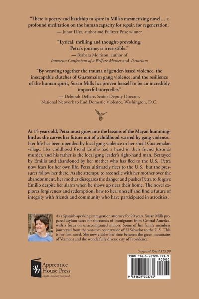 Award-winning book that recently earned acclaim from the prestigious Next Generation Indie Book Awards!At 15 years old, Petra must grow into the lessons of the Mayan hummingbird as she carves her future out of a childhood scarred by gang violence. Petra's life has been upended by local gang violence in her small Guatemalan village. Her childhood friend Emilio had a hand in their friend Justina's murder, and his father is the local gang leader's right-hand man. Betrayed by Emilio and abandoned by her mother who has fled to the U.S., Petra now fears for her own life. Petra ultimately flees to the U.S., but the pressures follow her there. As she attempts to reconcile with her mother over the abandonment, Petra is alarmed that her mother disregards the danger when he shows up near their home. The novel explores forgiveness and redemption, how to heal oneself and find a future of integrity with friends and community who have participated in atrocities.