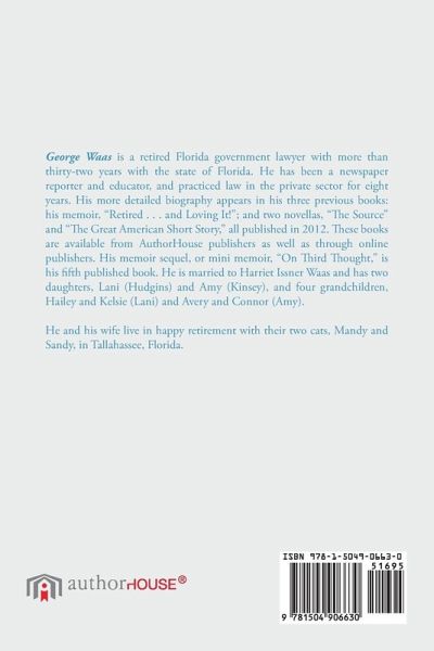 George Waas is a retired Florida government lawyer with more than thirty-two years with the state of Florida. He has been a newspaper reporter and educator, and practiced law in the private sector for eight years. His more detailed biography appears in his three previous books: his memoir, "Retired . . . and Loving It!"; and two novellas, "The Source" and "The Great American Short Story," all published in 2012. These books are available from AuthorHouse publishers as well as through online publishers. His memoir sequel, or mini memoir, "On Third Thought," is his fifth published book. He is married to Harriet Issner Waas and has two daughters, Lani (Hudgins) and Amy (Kinsey), and four grandchildren, Hailey and Kelsie (Lani) and Avery and Connor (Amy). He and his wife live in happy retirement with their two cats, Mandy and Sandy, in Tallahassee, Florida.