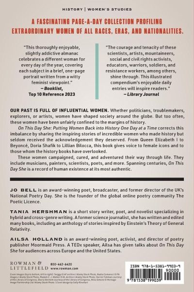 A fascinating page-a-day collection profiling extraordinary women of all races, eras, and nationalities. Our past is full of influential women. Whether politicians, troublemakers, explorers, artists, and even the odd murderer, women have shaped society around the globe. But too often, these women have been unfairly confined to the margins of history. On This Day She: Putting Women Back into History One Day at a Time corrects this imbalance. A day-by-day collection of inspiring stories about incredible women who made history but seldom received the acknowledgement they deserved, this book introduces readers to women of all colors, eras, and nationalities. From Queen Elizabeth I to Beyoncé, Doria Shafik to Lillian Bilocca, this book gives voice both to female icons and to those whom the history books have overlooked. These women campaigned, cured, and adventured their way through life. They include musicians, painters, scientists, poets, and more. Spanning centuries, On This Day She is a record of human existence at its most authentic.