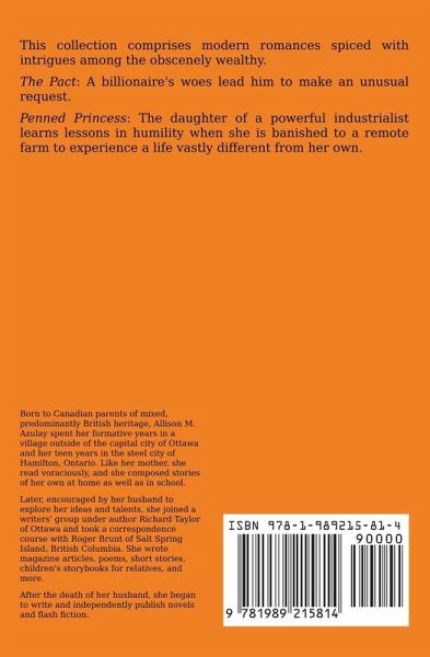 This collection comprises modern romances spiced with intrigues among the obscenely wealthy. The Pact: A billionaire's woes lead him to make an unusual request. Penned Princess: The daughter of a powerful industrialist learns lessons in humility when she is banished to a remote farm to experience a life vastly different from her own.