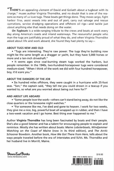 Tugboats hold a fascination not only for anyone who has worked aboard a vessel or around a harbor but for many land-bound folks as well. There is something about their chunky, powerful build and their often risky but vital work that excites our interest and admiration. The captains and crews of the tugboats are justifiably proud of what they do, and they have some great stories to tell about the ships and barges they tow or push; the harbors, storms, tides, and dangerous passages they must negotiate; the unions; the pilots; the different designs and capabilties of their boats; and the way the boats and their livelihood are irrevocably changing.